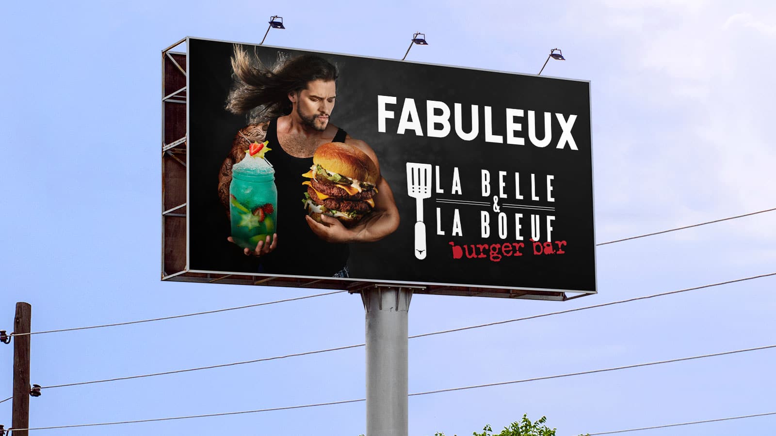 Billboard, poster and packaging design for La Belle et La Boeuf burger bar.